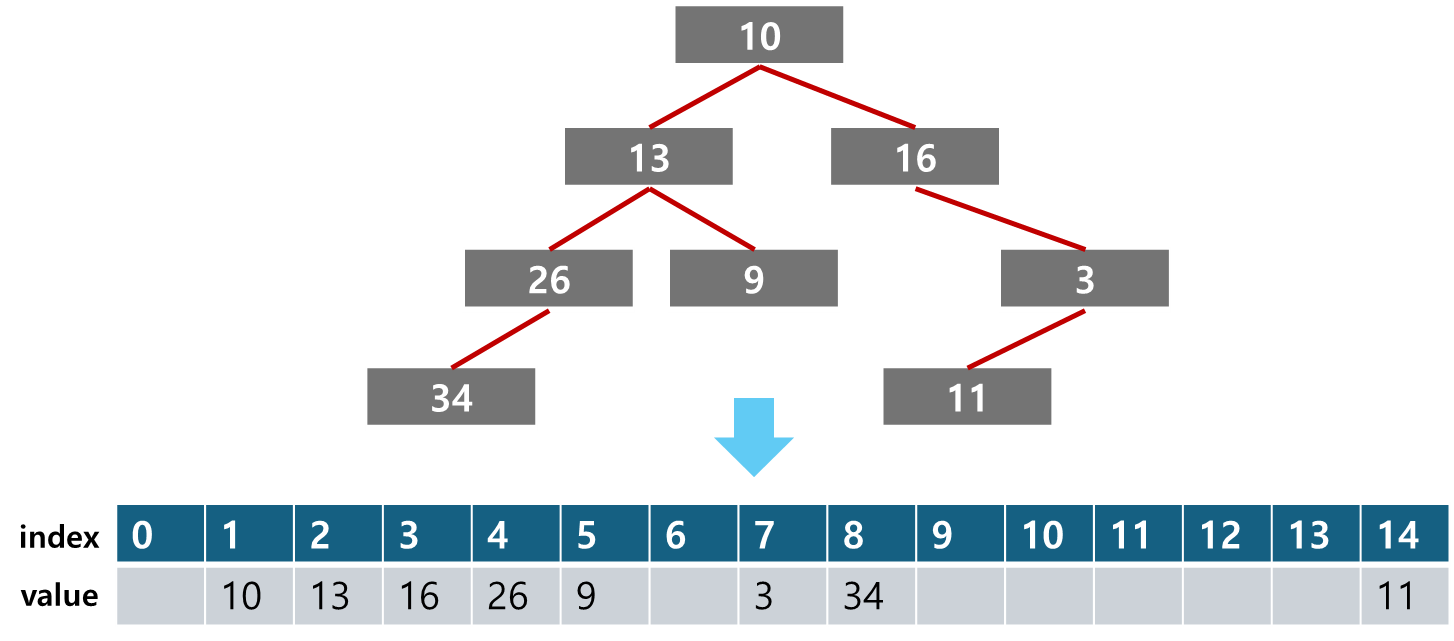 - 구현하고자 하는 이진 트리는 포화 이진 트리의 부분 집합으로 보고, 배열의 index를 활용하는 방법
