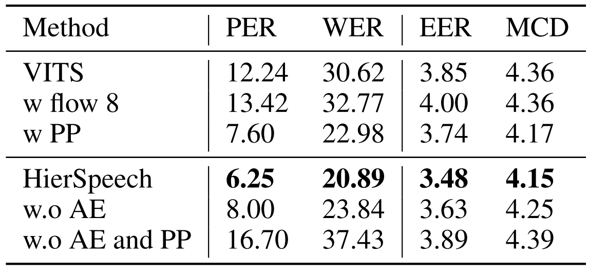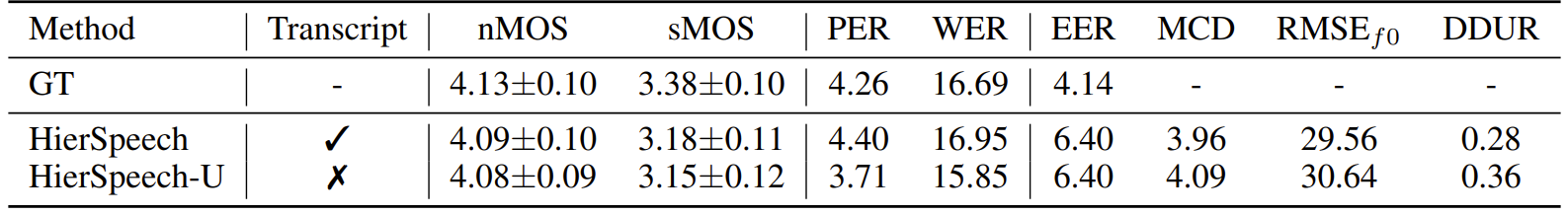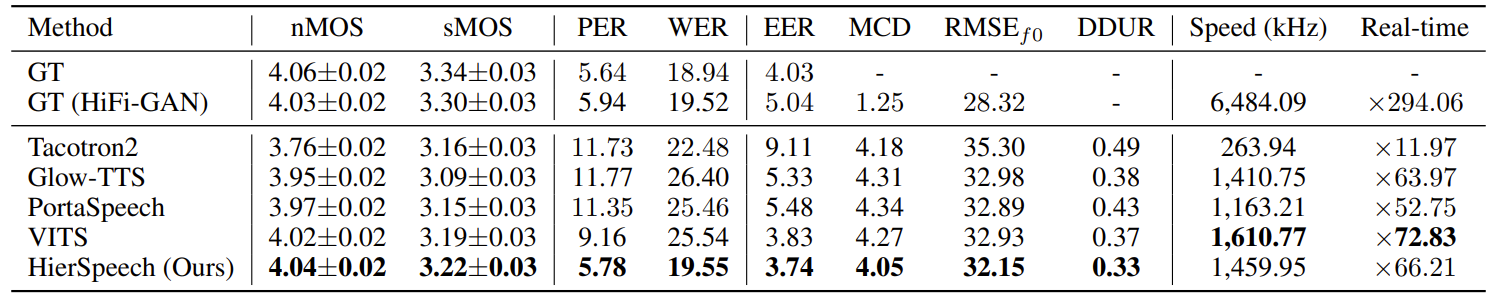- 결과적으로 HierSpeech가 다른 모델들에 비해 우수한 성능을 보임