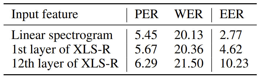 - Linear spectrogram이 XLS-R representation 보다 더 나은 transfer performance를 보임