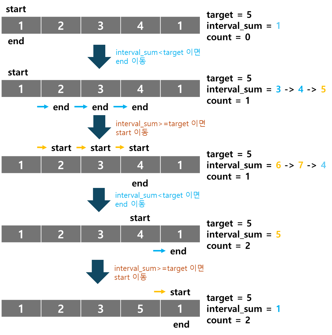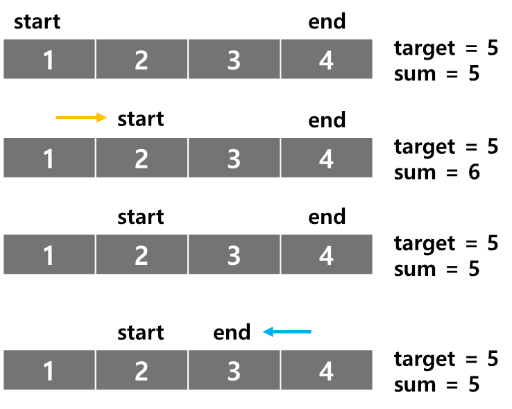 - start에서 end 포인터까지의 합이 기준보다 작으면 end 포인터를 이동, 크면 start 포인터를 이동