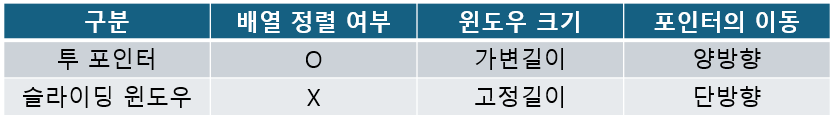 - 투 포인터와 비슷하지만 슬라이딩 윈도우는 정렬 여부에 관계없이 사용 가능함