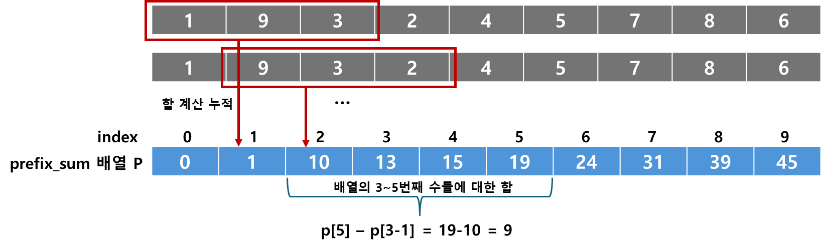 - 주어진 각 수들에 대해 prefix sum을 계산하여 새로운 배열 $P$로 저장