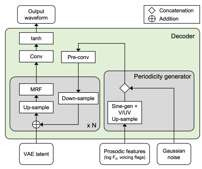- 이때 parameter는 normalizing flow를 통해 expressive piror 분포를 학습하는 데 사용되고, pitch/voicing flag와 같은 prosodic feature는 sample-level sinusoidal source signal을 생성하는 데 사용됨 - 이후 decoder에서 periodic source는 HiFi-GAN vocoder의 모든 upsampled representation에 제공되어 target waveform의 pitch stability를 보장함