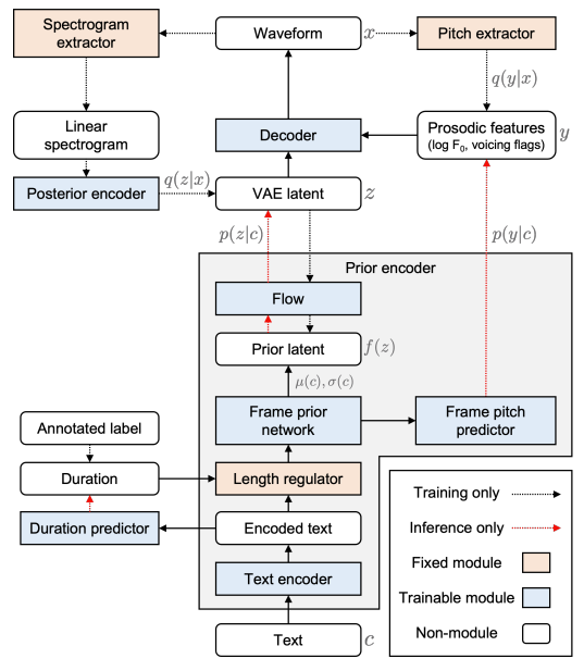 - 구조적으로는 prior encoder와 waveform decoder 2가지 module로써 구성됨