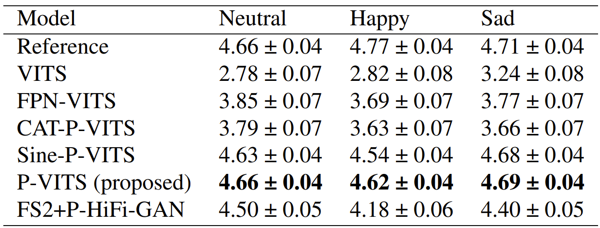 - MOS 측면에서 제안된 Period VITS (P-VITS)가 가장 우수한 성능을 보임
