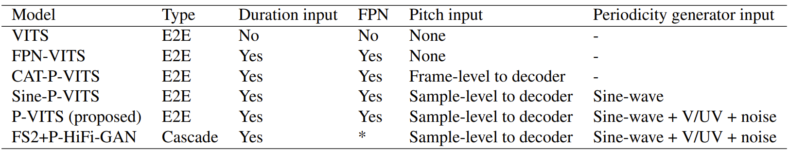 - Sine-P-VITS : periodicity generator에서 voicing flag와 Gaussian noise를 생략한 모델