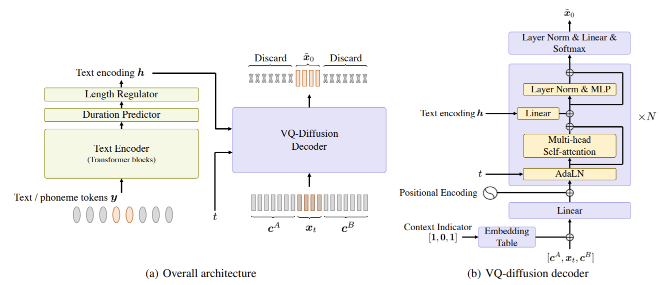 - 이후, text encoder의 output은 해당 duration 값을 기반으로 expand 되어 semantic token의 length와 match 하는 text encoding $h$를 생성함 - VQ-diffusion decoder의 input sequence $[c^{A},x_{t},c^{B}]$는 $t$ diffusion step으로 corrupt 된 data $x_{t}$를 preceding/following context $c^{A}, c^{B}$와 concatenate 하여 구성됨