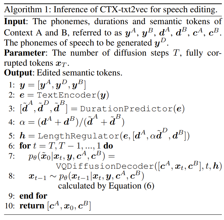 - Speech editing을 위한 inference process는 아래 [Algorithm 1]과 같음