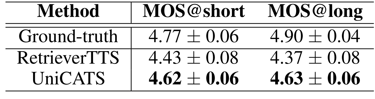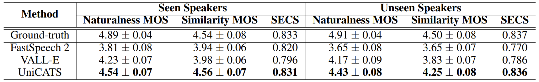 - 결과적으로 UniCATS는 continuation과 editing, 2가지의 context-aware TTS task를 모두 처리할 수 있음