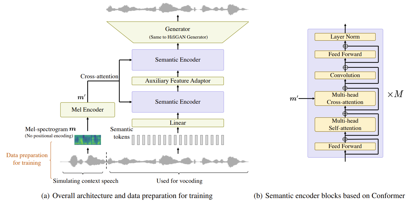- 여기서 CTX-vec2wav의 semantic encoder는 $M$개의 Conformer-based block으로 구성되고, 각 block은 cross-attention layer를 사용하여 mel-spectrogram의 acoustic context를 반영함