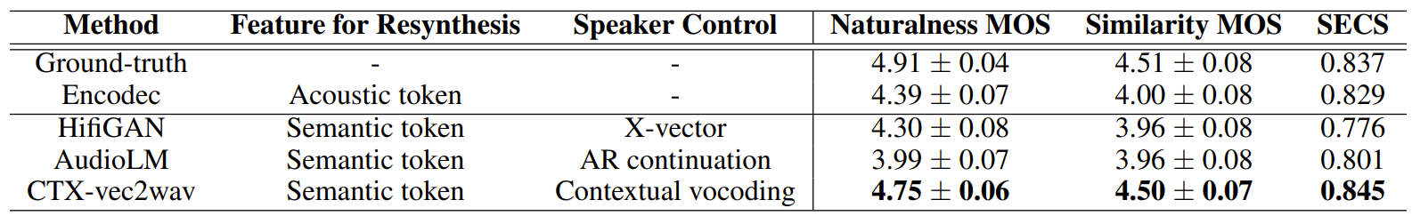 - Semantic token을 waveform으로 변환할 때, speaker identity와 같은 acoustic context를 반영하기 위해 CTX-vec2wav에 contextual vocoding을 도입하여 speaker embedding과 acoustic token에 대한 의존성을 제거함