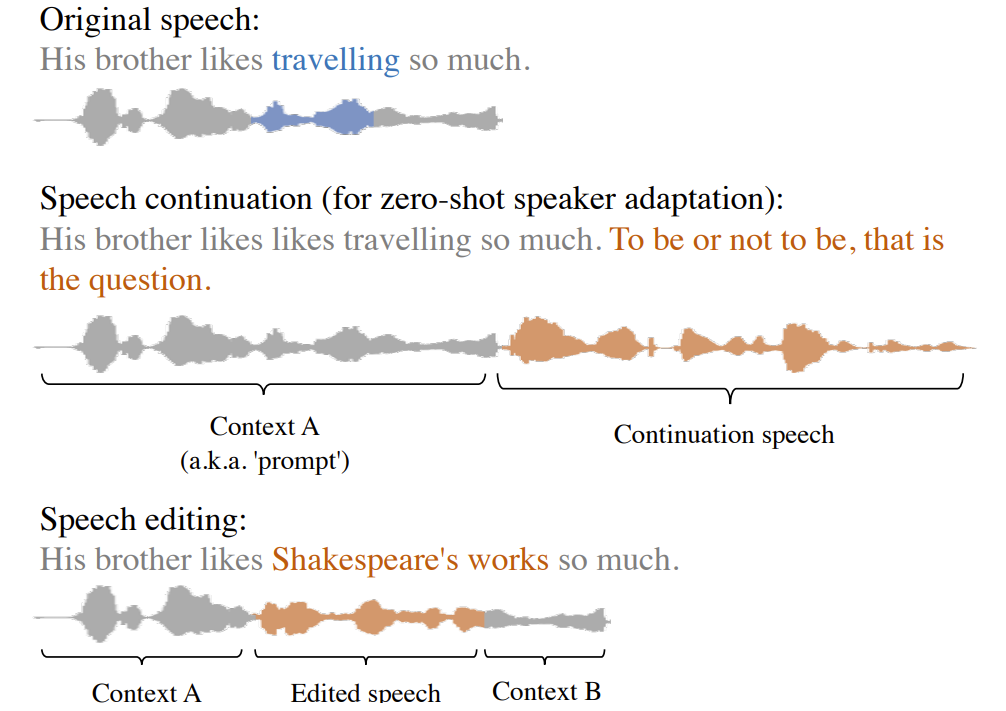 -> 이러한 모델들은 대부분 autoregressive 모델을 활용하기 때문에, target speaker에 대한 짧은 speech prompt 만으로도 input text를 기반으로 acoustic token을 생성하여 speech continuation을 수행할 수 있음 - 한편으로 context-aware TTS에는 이러한 speech continuation 외에도 speech editing task도 존재함