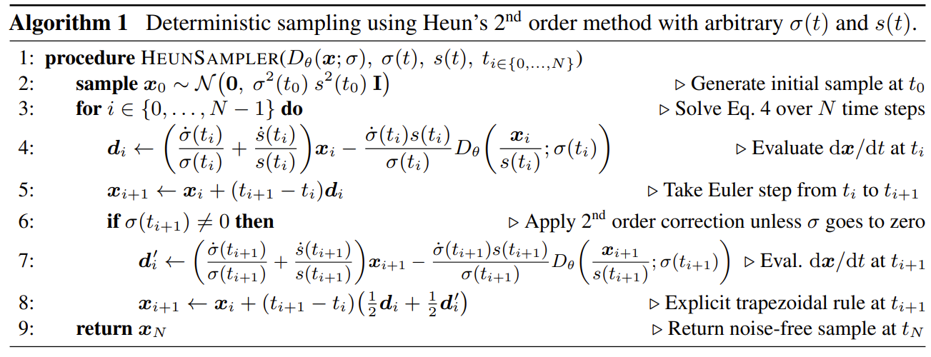 - 각 step $i$에서 noise level $t_{i}$ ($=\sigma(t_{i})$)의 sample $x_{i}$가 주어지면, 다음의 두 sub-step을 수행함