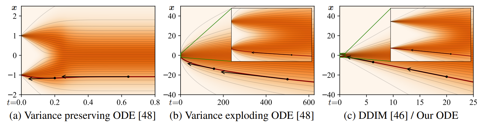- 즉, linear solution trajectory에 해당하는 noise level에 따라 천천히 변화한다고 볼 수 있고, 실제로 아래 그림에서 (c)의 1D ODE는 이러한 효과를 나타냄