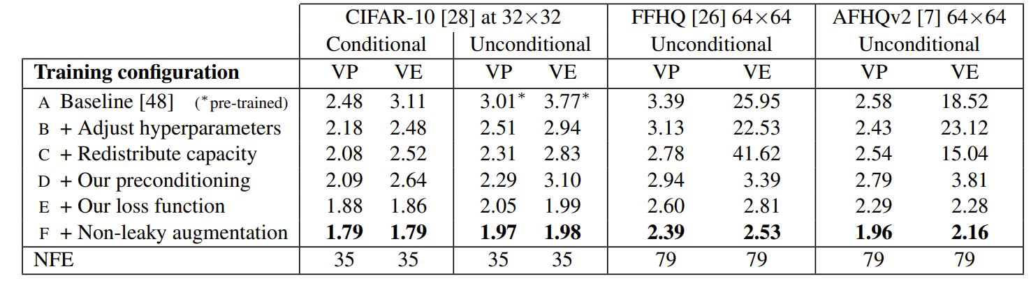- 결과적으로 위의 표와 같이, 제안한 $p_{train}$과 $\lambda$ (config E)를 pre-conditioning (config D)와 함께 사용했을 때, 모든 경우에서 FID의 상당한 개선으로 이어짐