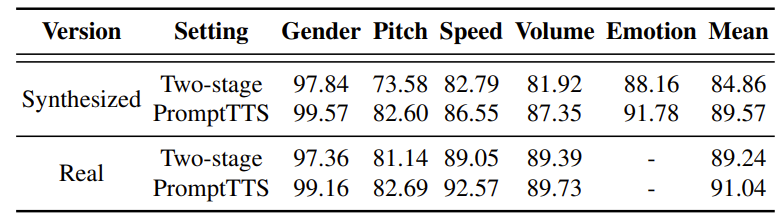 - 반면 PromptTTS는 cascaded error 없이 end-to-end로 information을 transfer 하므로 더 나은 accuracy를 달성할 수 있음