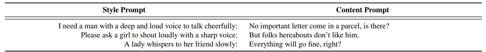 - Input prompt는 style description (Style Prompt)과 음성으로 변환할 text를 포함하는 content description (Content Prompt)로 구성됨
