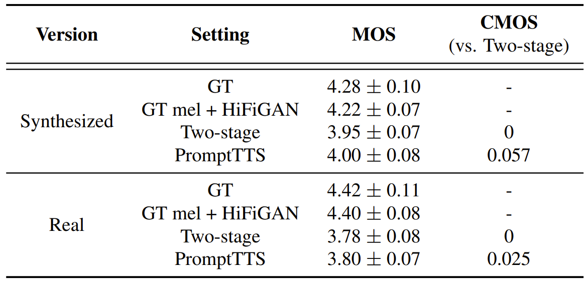 - PromptTTS는 HiFi-GAN을 적용하여 음성을 합성했을 때, two-stage 방식보다 더 우수한 성능을 보임