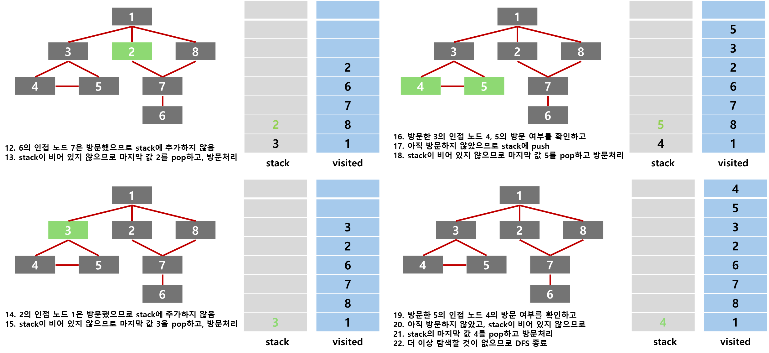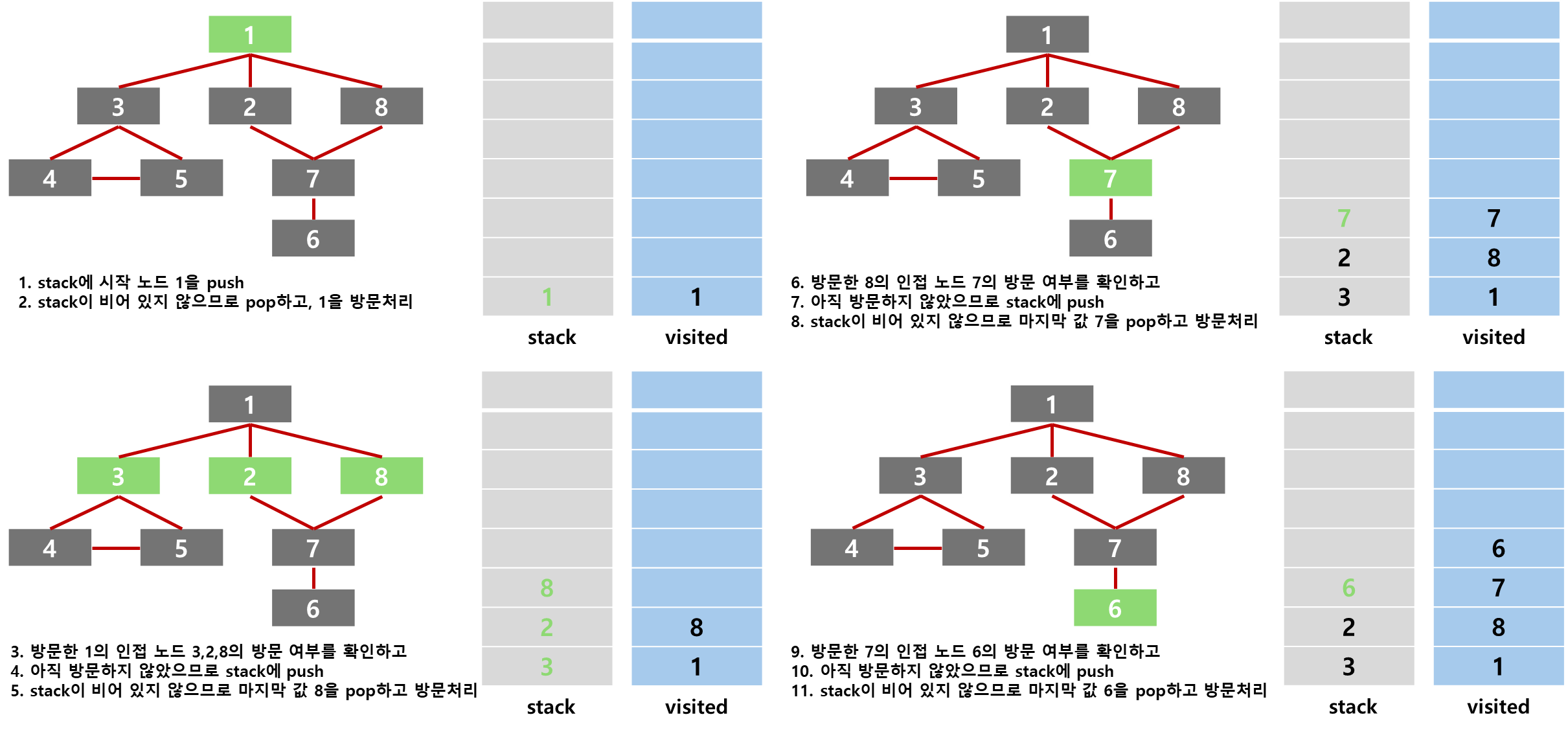 - 방문하지 않은 노드가 있다면 스택에 push - 위 2~4 과정을 반복