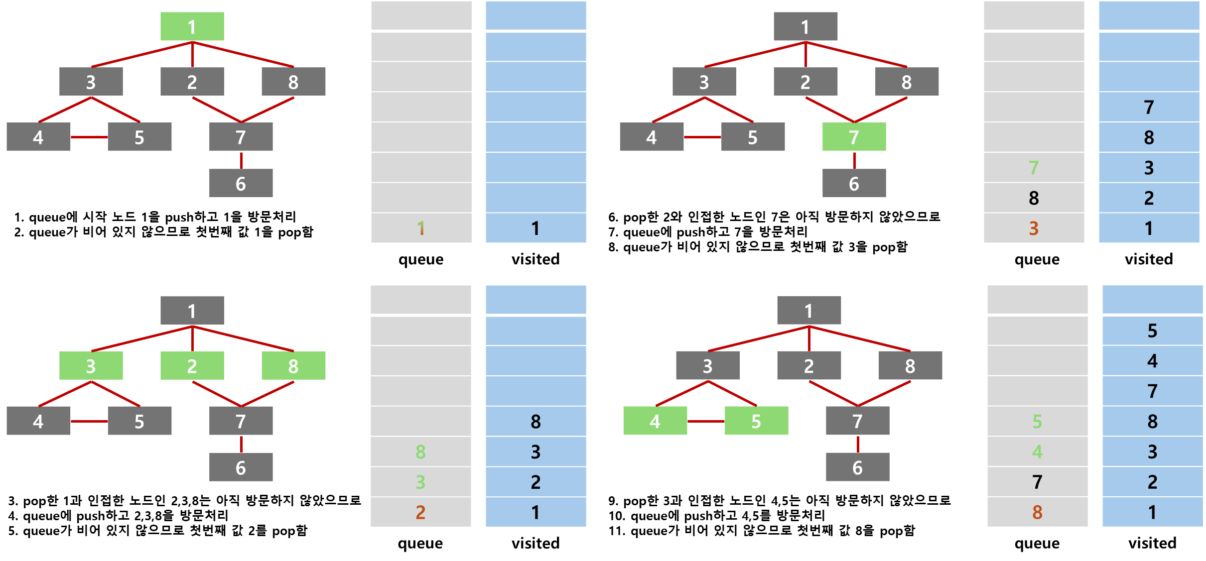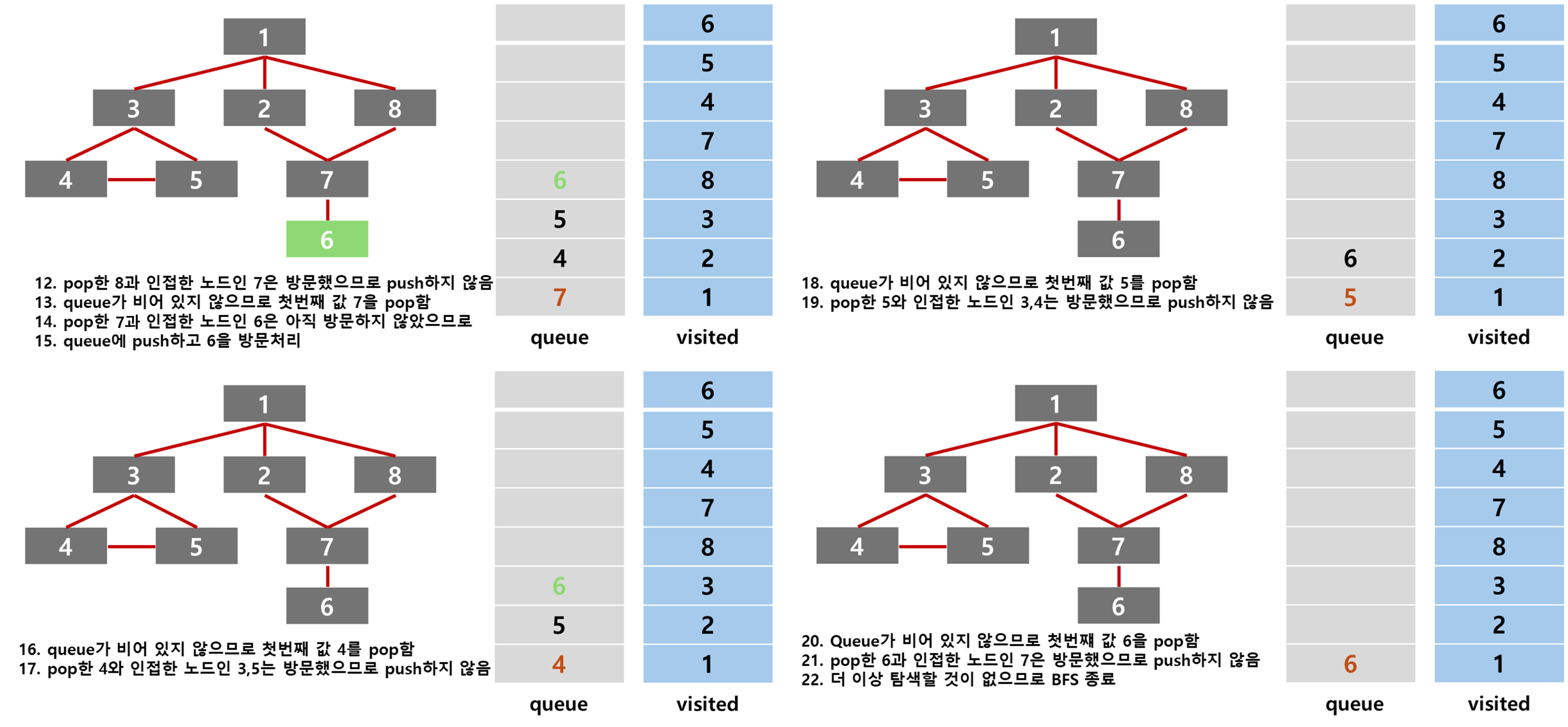 - BFS는 큐에 방문할 노드를 push 하면서 방문 처리