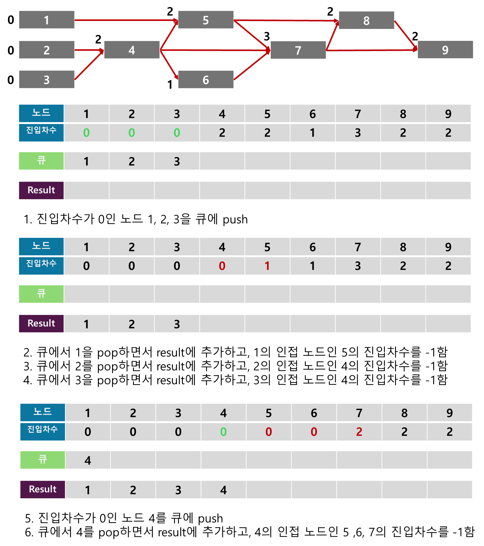 - 큐에서 노드를 pop 하면서, 인접 노드의 진입차수를 1씩 줄임
