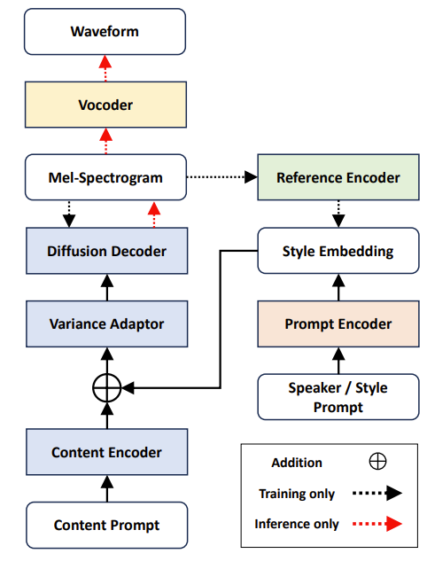 - Speaker individuality에 대한 제한적인 style prompt에 의존하는 기존 방식과는 달리, 추가적인 speaker prompt를 활용하여 다양한 speaker에 대한 acoustic feature mapping을 효과적으로 학습함