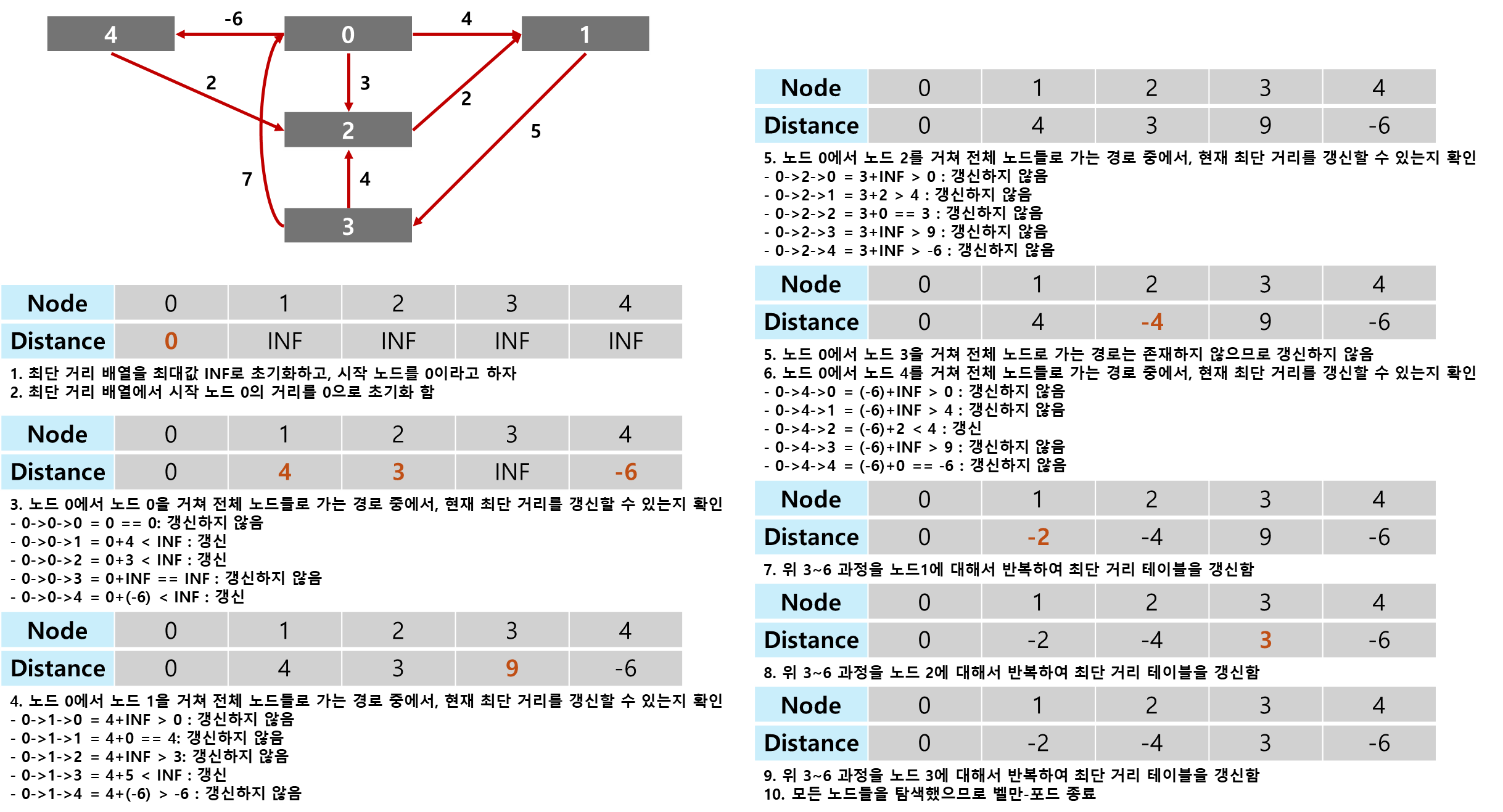 - 벨만-포드 알고리즘 : 최단 경로를 찾는 알고리즘 중 하나로, 매 단계마다 모든 간선의 가중치를 확인하여 최단 거리를 갱신하는 방식으로 동작함