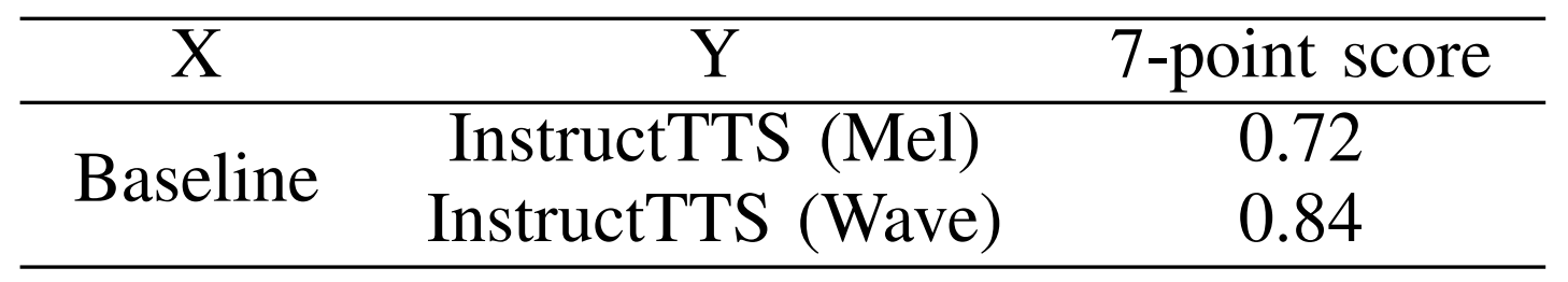 - AXY preference test 측면에서 합성된 음성의 naturalness를 비교해 보면, 마찬가지로 InstructTTS의 결과를 더 선호하는 것으로 나타남
