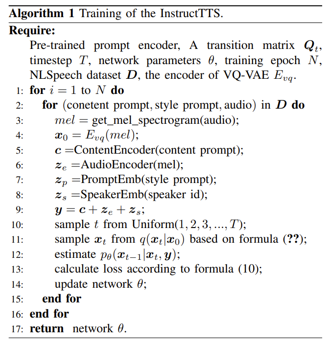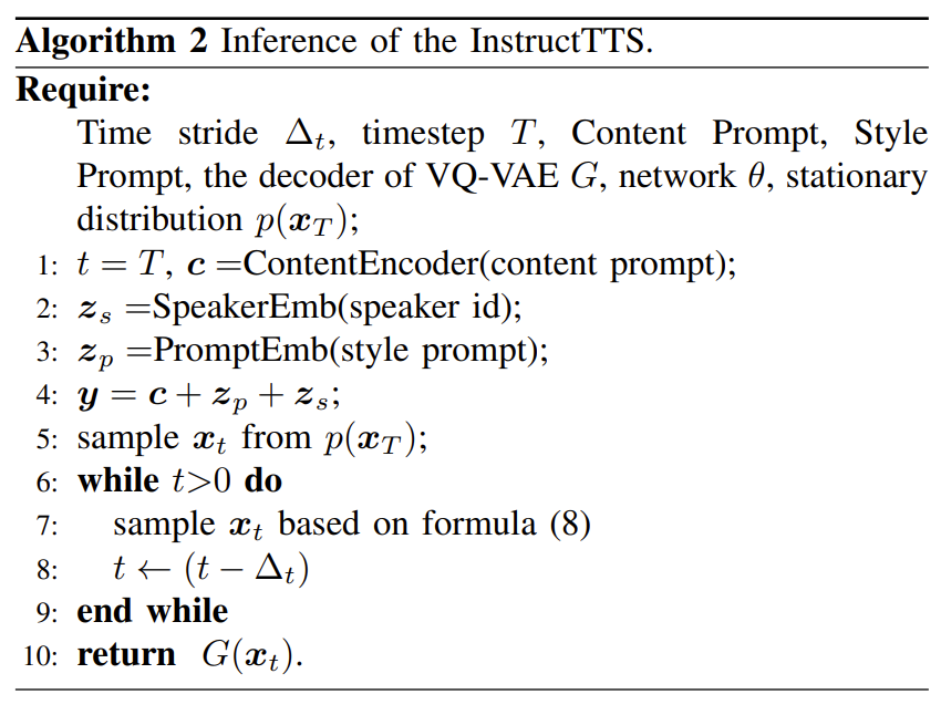 - 최종적으로 InstructTTS의 training obejctive와 inference process를 요약하자면