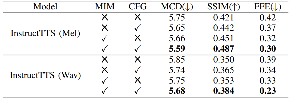 - InstructTTS에서 improved mask를 활용하는 경우 더 나은 성능을 얻을 수 있음