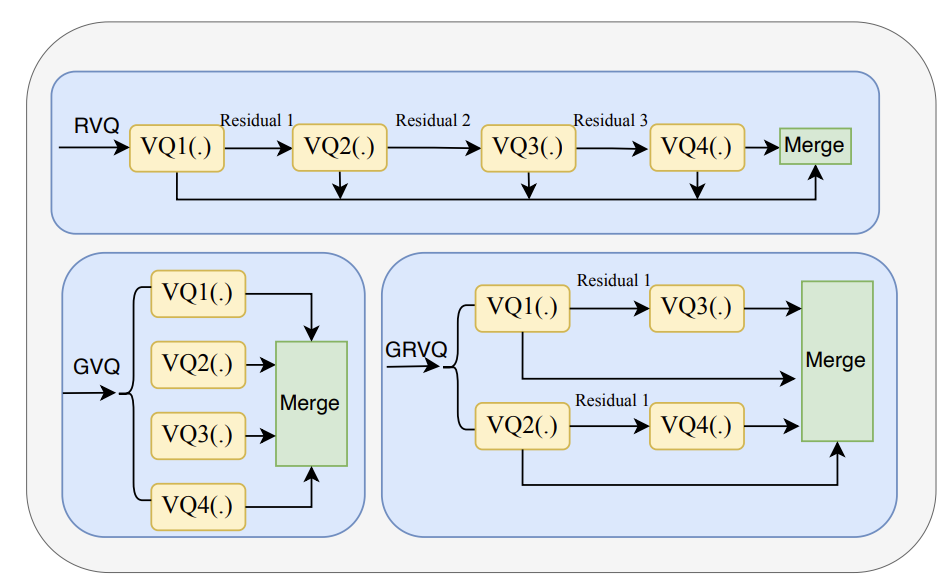 - Residual Vector Quantization (RVQ), Group Vector Quantization (GVQ), Group Residual Vector Quantization (GRVQ)를 비교해 보면