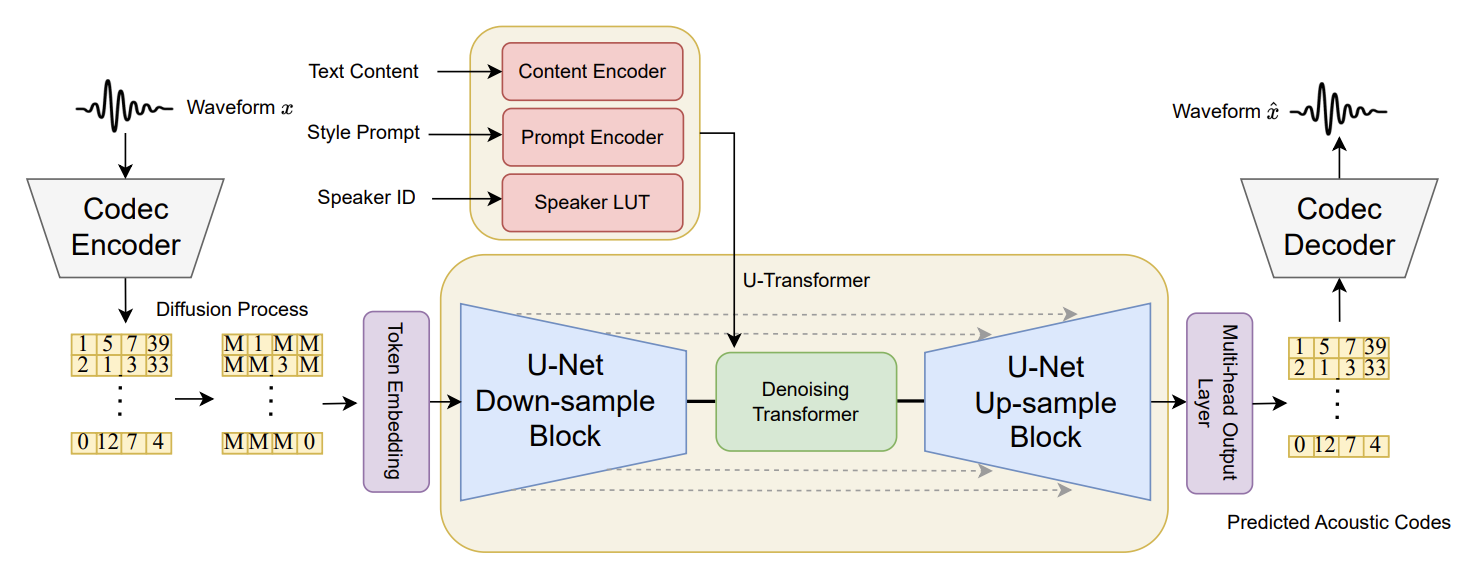 - Vector-quantized acoustic token을 사용하기 위해, discrete latent space를 모델링하고 discrete diffusion model을 활용함