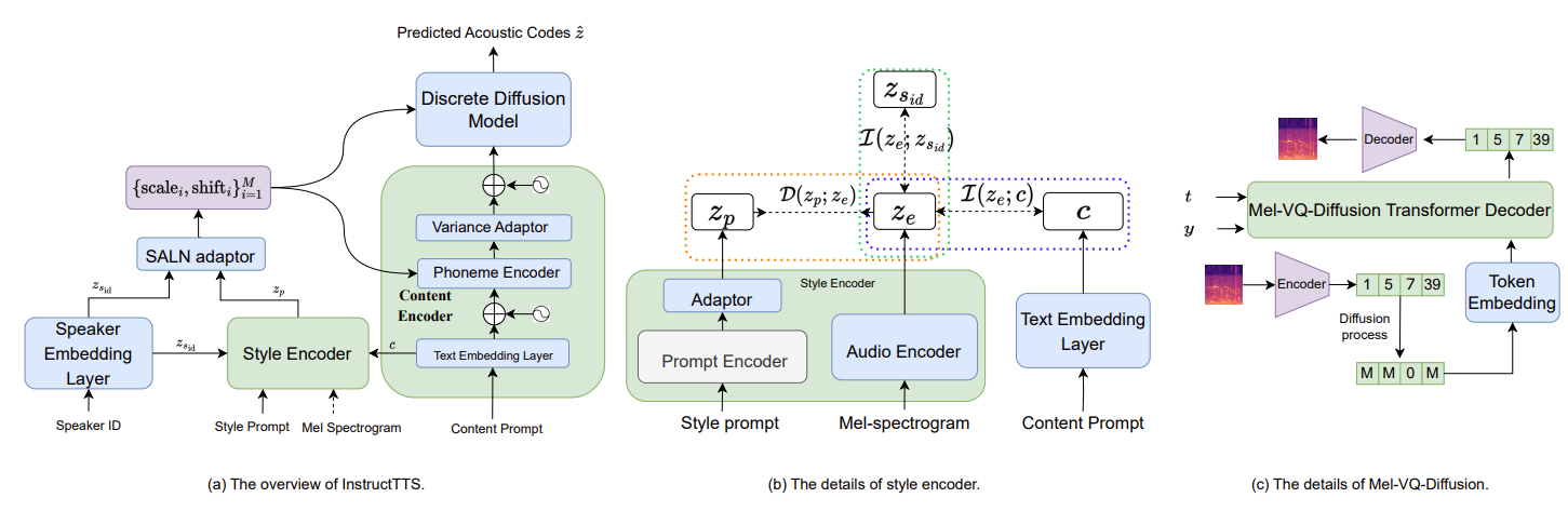 - InstructTTS는 content encoder, style encoder, speaker embedding module, Style-Adaptive Layer Normalization (SALN) adaptor, discrete diffusion decoder로 구성됨