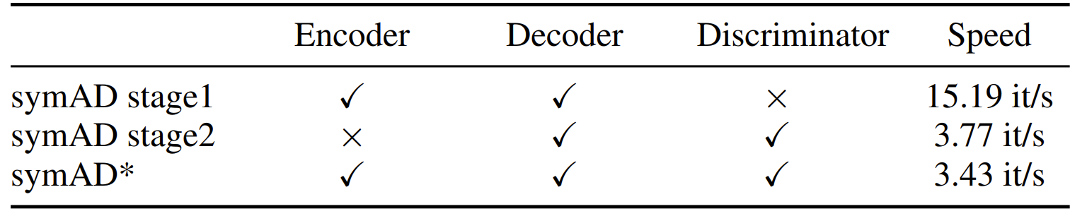 - 한편으로 제안된 training paradigm을 적용하지 않은 SymAD*의 성능 저하는 GAN training이 decoder 성능 개선에 큰 영향을 준다는 것을 의미함