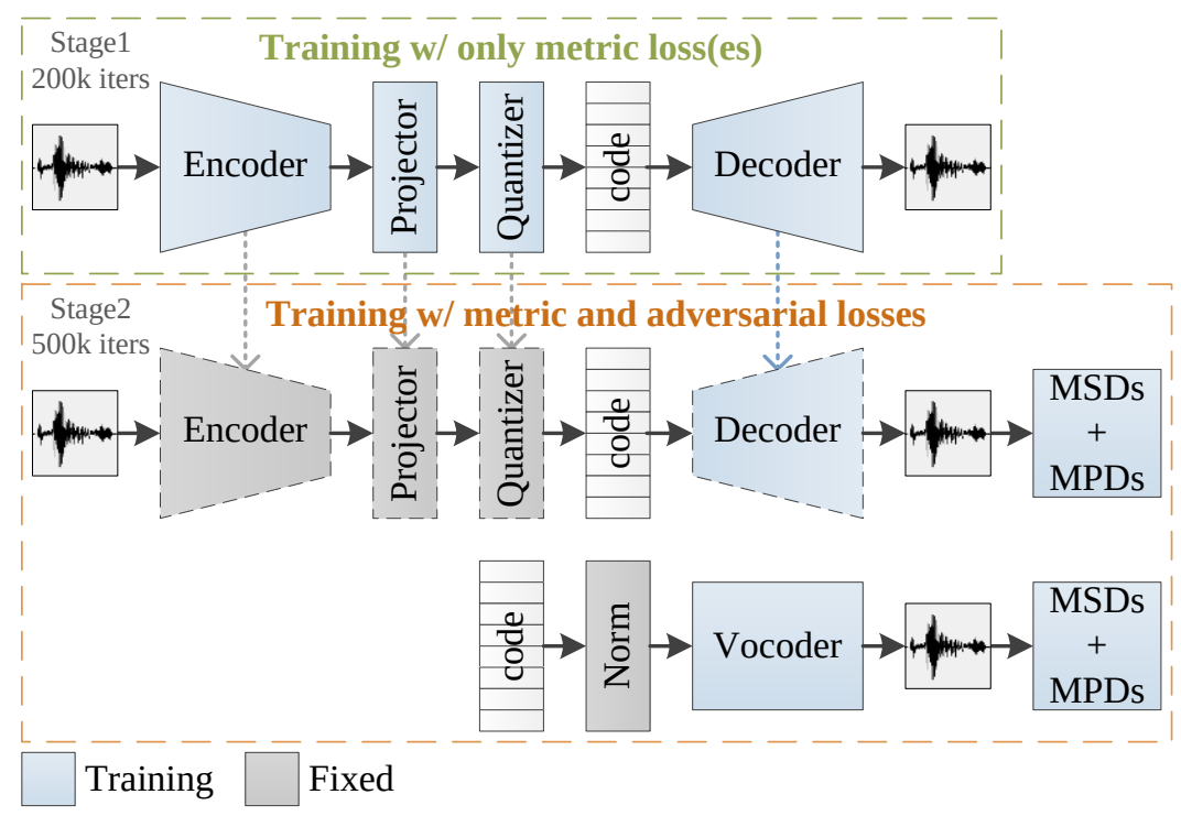 - HiFi-GAN vocoder를 통합하고 efficient training paradigm을 적용한 real-time neural audio codec