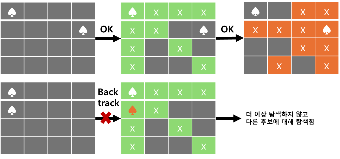 - 백트래킹 : 가능성이 없는 해는 포기하여 되돌아가고, 가능성이 높은 해결책만을 탐색하는 방법