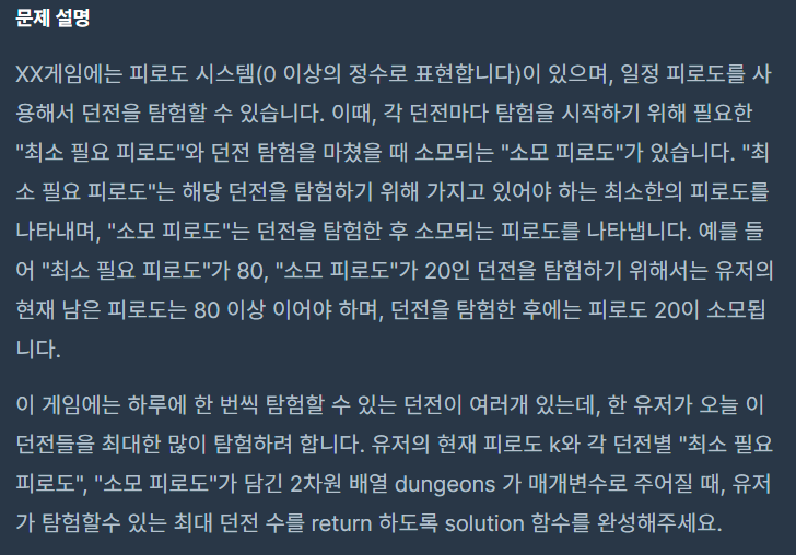 - Input : 현재 피로도 `k`, 배열 `dungeon` : [최소 필요 피로도, 소모 피로도] 형태