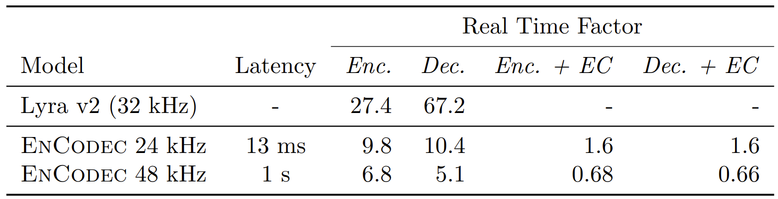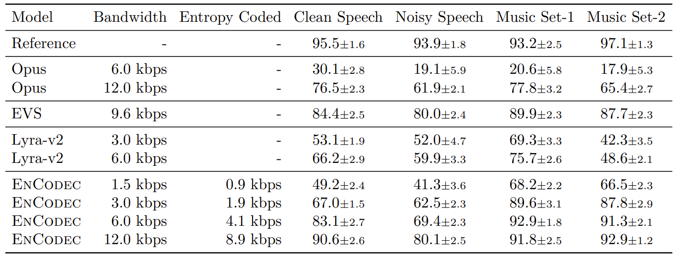 - 특히 3kpbs의 EnCodec은 6kbps의 OPUS나 12kbps의 Lyra v2 보다 더 나은 성능을 달성함