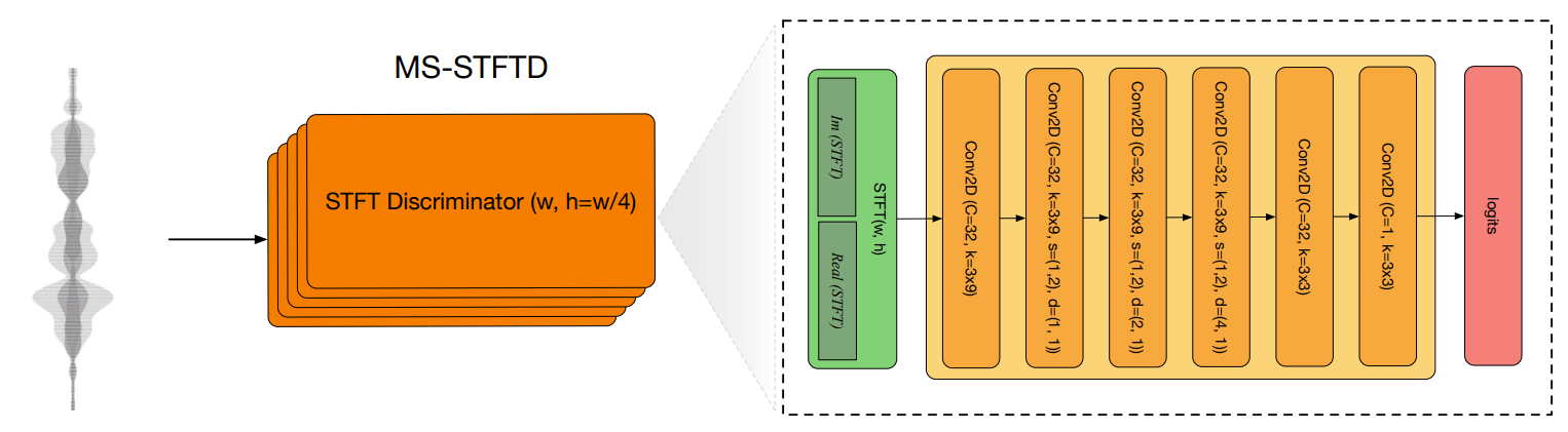 - 생성된 sample의 품질을 더욱 향상하기 위해, 아래 그림과 같은 multi-scale STFT discriminator (MS-STFTD)를 기반으로 하는 perceptual loss를 도입