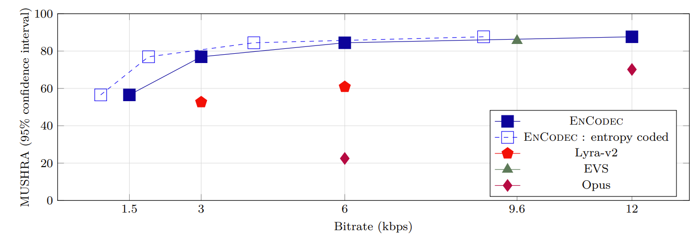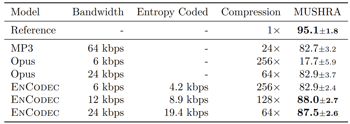 - EnCodec은 6kpbs에서 OPUS 보다 뛰어나고, 64kpbs의 MP3와 비교할만한 성능을 달성함