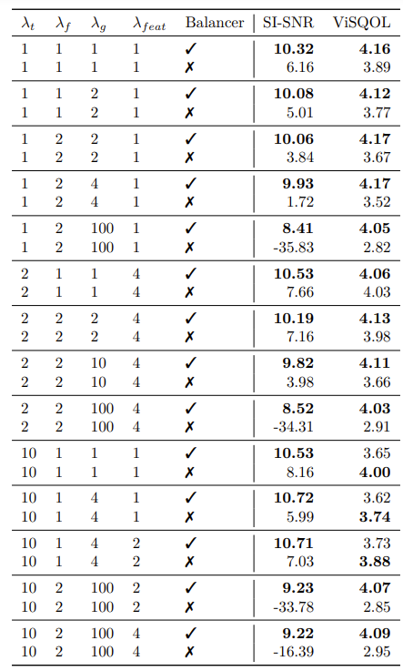 - Balancer의 유무와 다양한 $\lambda_{t}, \lambda_{f}, \lambda_{g}, \lambda_{feat}$ 값에 대해 EnCodec의 성능을 비교해 보면