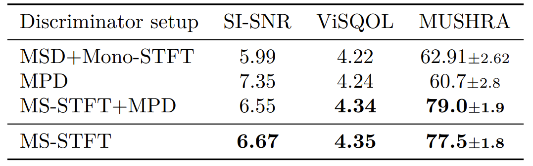 - 이때 EnCodec에서 Multi-Scale Discriminator (MSD), Multil-Period Discriminator (MPD), Multi-Scale STFT Discriminator (MS-STFTD), MS-STFTD+MPD를 각각 비교해 보면
