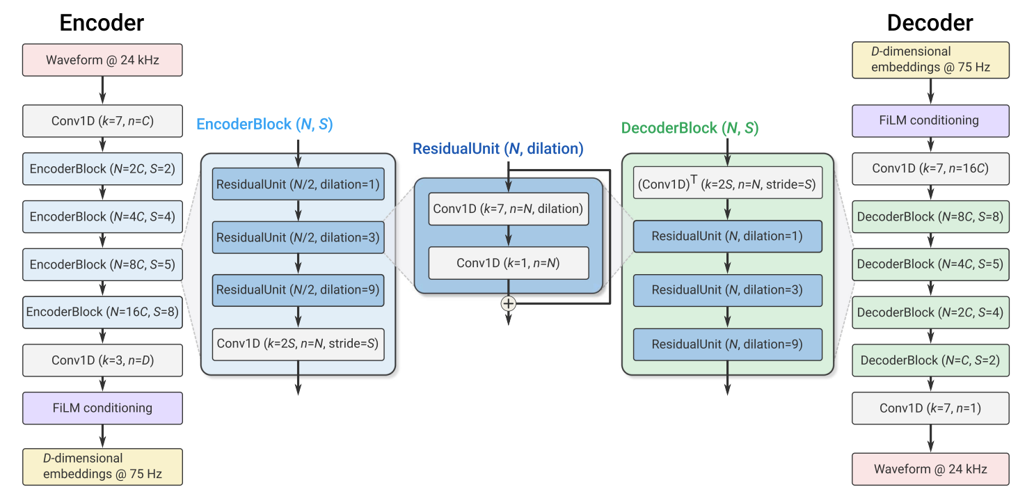 - Fully convolutional encoder는 time-domain waveform을 input으로 receive 하여 더 낮은 sampling rate로 embedding sequence를 생성한 다음, residual vector quantizer로 quantize