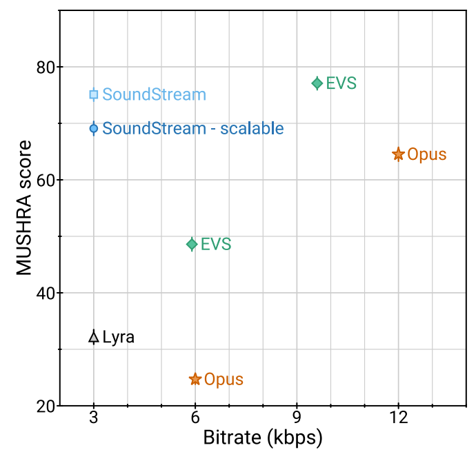 - 기존 codec을 SoundStream의 성능과 일치시키기 위해서는 EVS는 최소 9.6 kpbs, OPUS는 12 kbps의 bitrate가 필요함