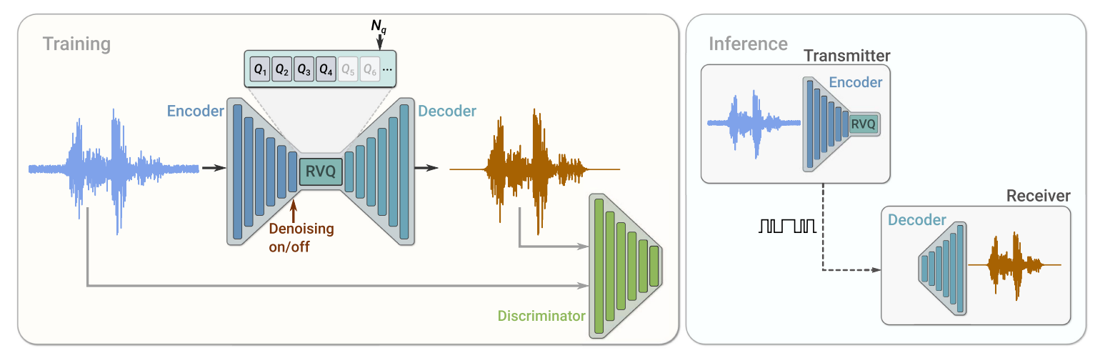 - Encoder, decoder, quantizer로 neural codec을 구성하고 reconstruction loss, adversarial loss를 적용하여 end-to-end로 training 함