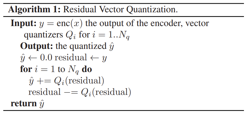- 이후 아래의 [Algorithm 1]과 같이 additional $N_{q-1}$ vector quantizer에 의해 iteratively quantize 됨