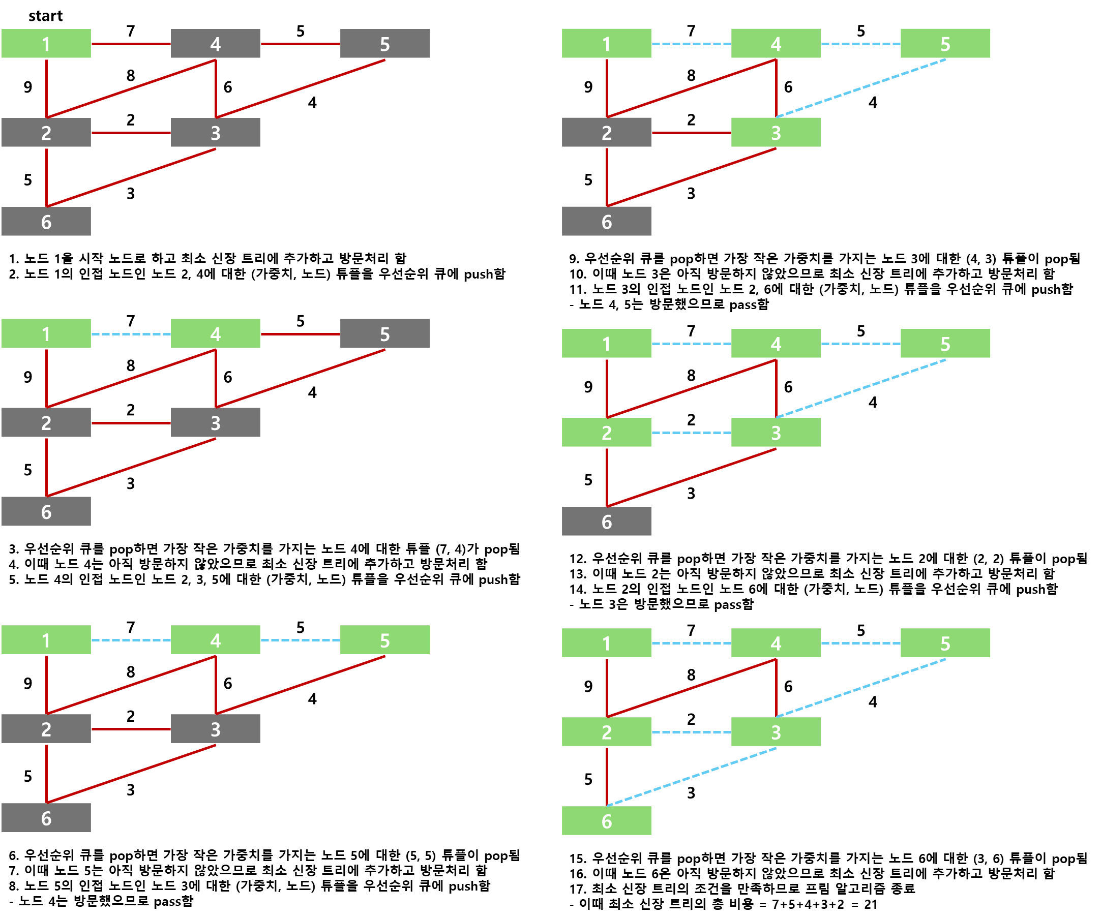 - 최소 신장 트리와 연결되어 있는 노드 중에서 가장 가중치가 작은 노드를 최소 신장 트리에 추가