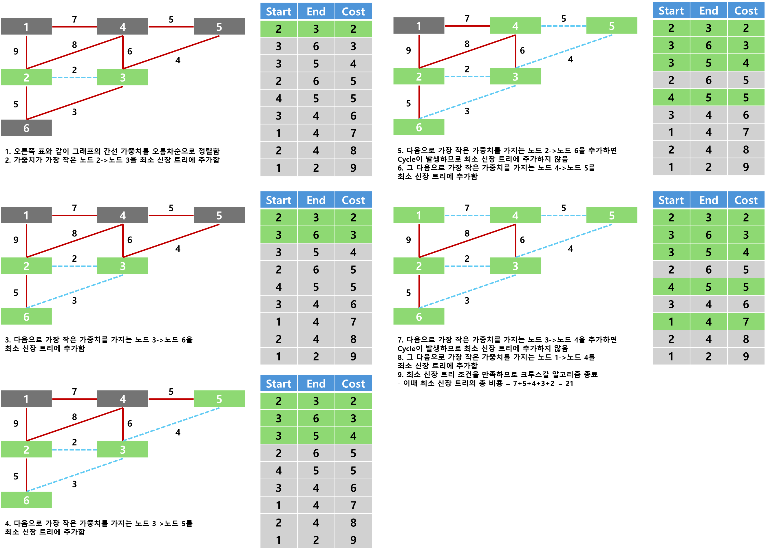 - Cycle이 발생하는 경우 추가하지 않음 - 위 과정을 신장 트리 조건을 만족할 때 까지 반복