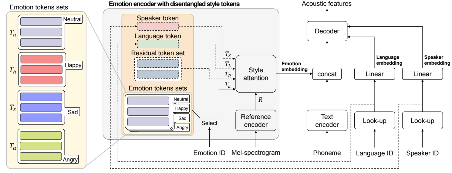 - GST 방법론을 사용하여 target speaker의 reference embedding과 style token 간의 similarity를 학습 - Disentanglement ability를 향상하기 위해 speaker, language, residual, emotion에 대한 4가지 style token을 활용