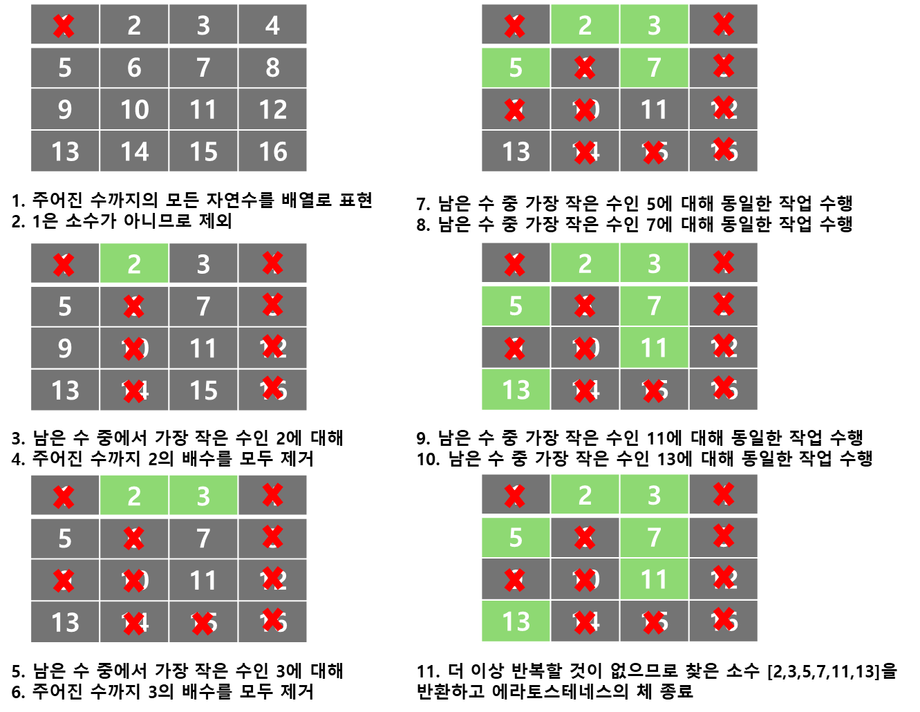 - 주어진 수까지의 모든 소수를 찾는데 유용하지만, 메모리를 많이 소모함
